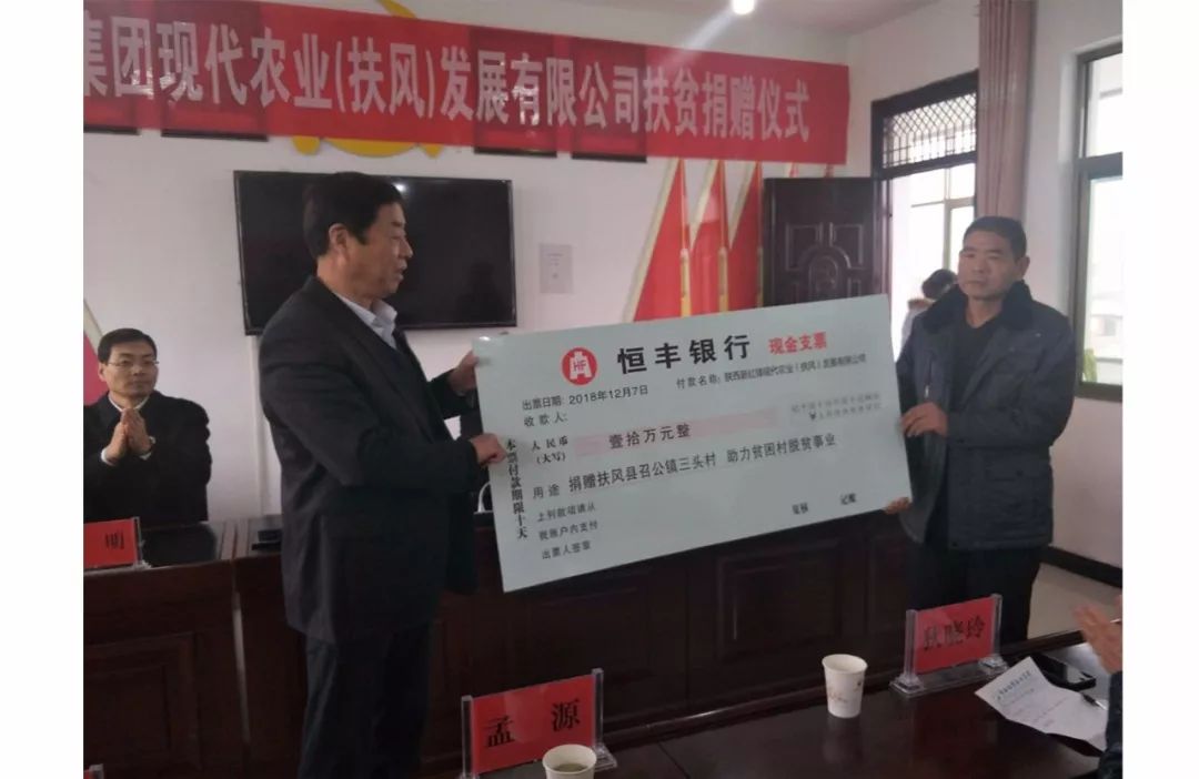 12月7日,紅鋒集團(tuán)旗下現(xiàn)代農(nóng)業(yè)公司為扶風(fēng)縣召公鎮(zhèn)三頭村捐資十萬元,助力村委會(huì)基礎(chǔ)設(shè)施和環(huán)境建設(shè),推進(jìn)貧困村脫貧工作進(jìn)程。
