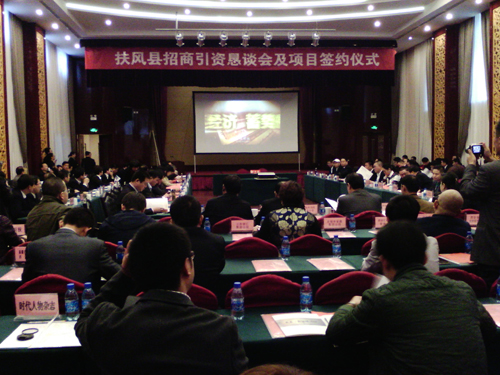 2014年10月15日,扶風縣招商引資懇談會暨招商項目簽約儀式在扶風關中風情園五樓會議室舉行。集團總裁周鋒、總裁助理王彥濤受扶風縣人民政府邀請參加了本次大會。出席本次大會的地方領導有:寶雞市人民政府副市長丁琳;中共扶風縣委書記周宇松;扶風縣人民政府縣長陳愛民;扶風縣人大常委會主任梁宗建;扶風縣政協(xié)主席黎煥煥等。本次會議由副縣長段葆青主持。